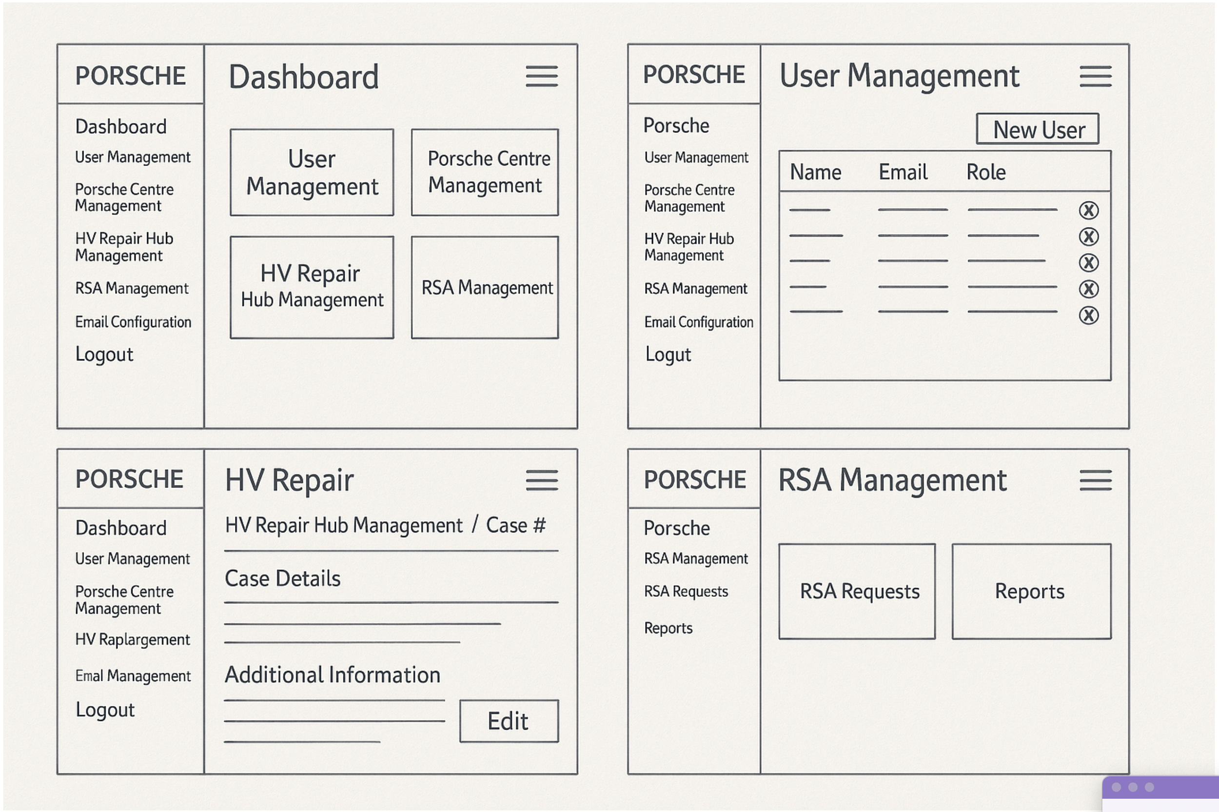 Initial sketches mapped key modules: User Management, Porsche Centre Management, HV Repair Hub, RSA Workflow, and Email Configuration. Primary goal was intuitive navigation and module isolation.